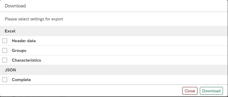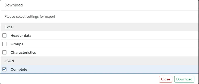 In this pop-up window, you can choose between an Excel download (separate) and JSON (complete) download.