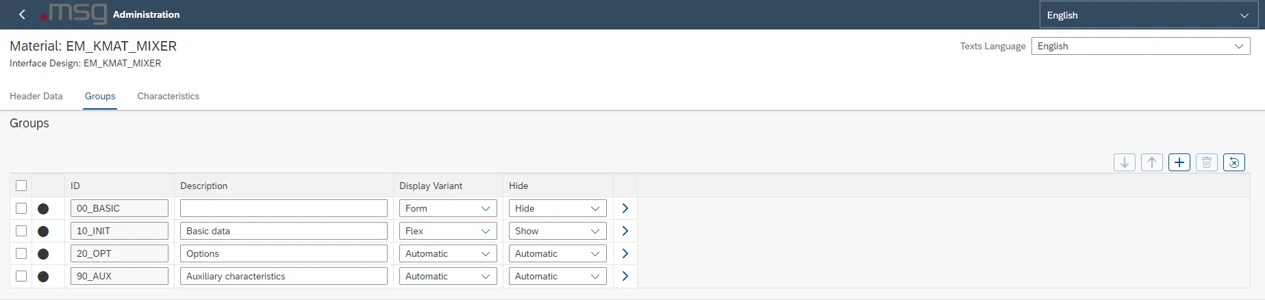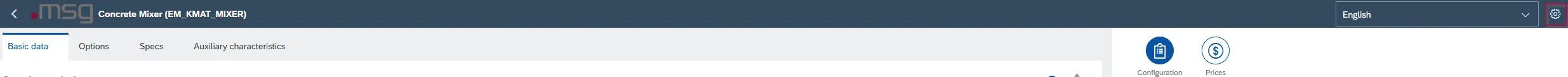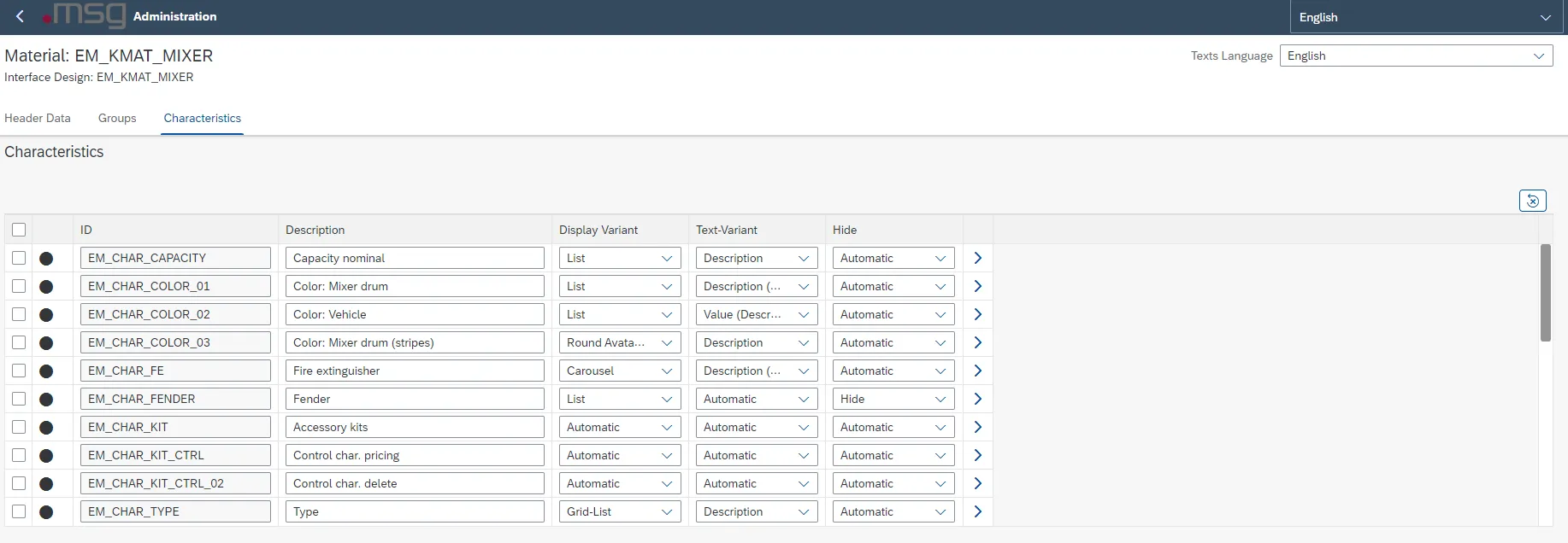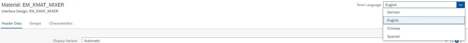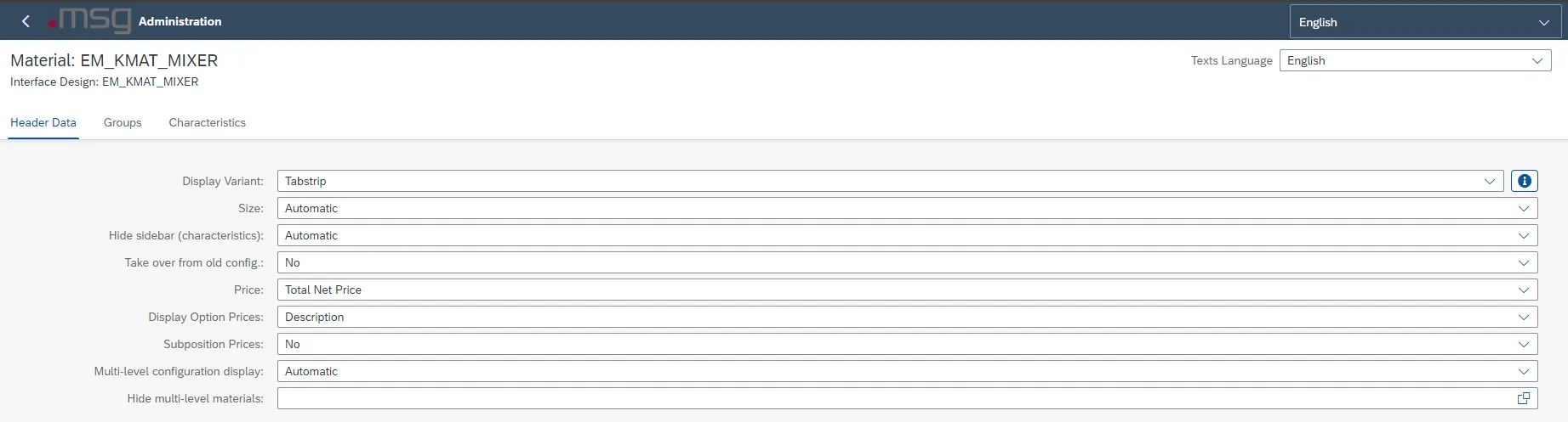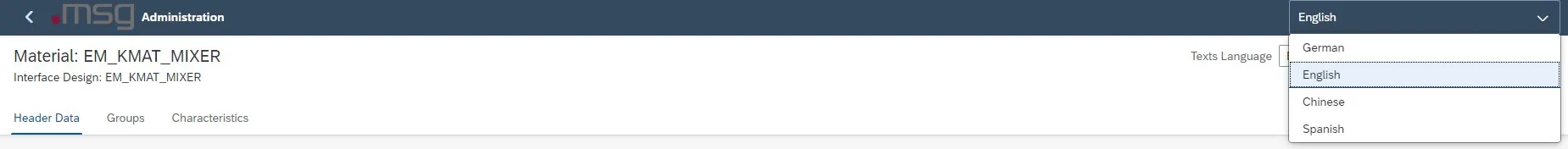 Directly underneath, you can switch between the available languages of the configuration model. The description of the characteristics and characteristic values, long texts and groups of the interface design are language dependent.