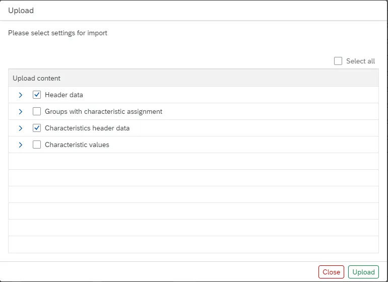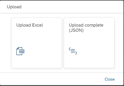 When you select the button “Upload complete (JSON)”, you must select the desired JSON file in the file browser. After selecting the file, you can select which data records are to be uploaded.