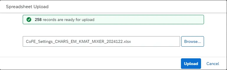 When you select the button “Upload Excel”, the desired Excel file must be selected in the file browser. After selecting the file, the number of data records available for upload is displayed.