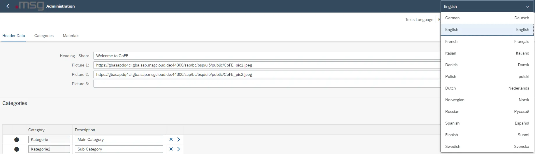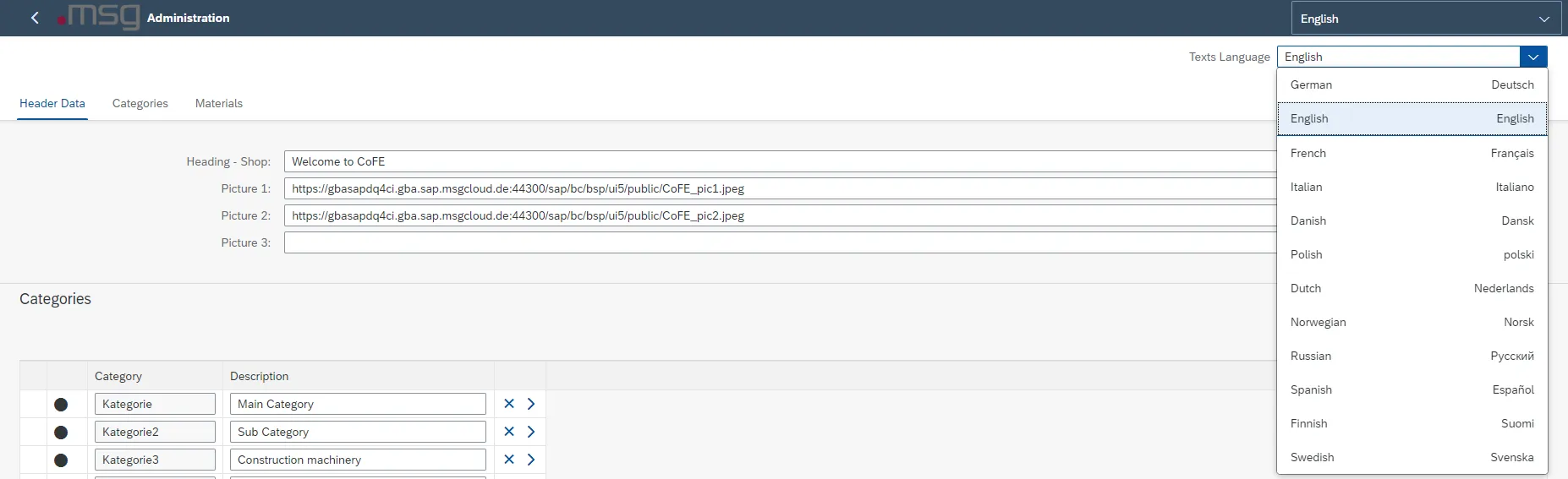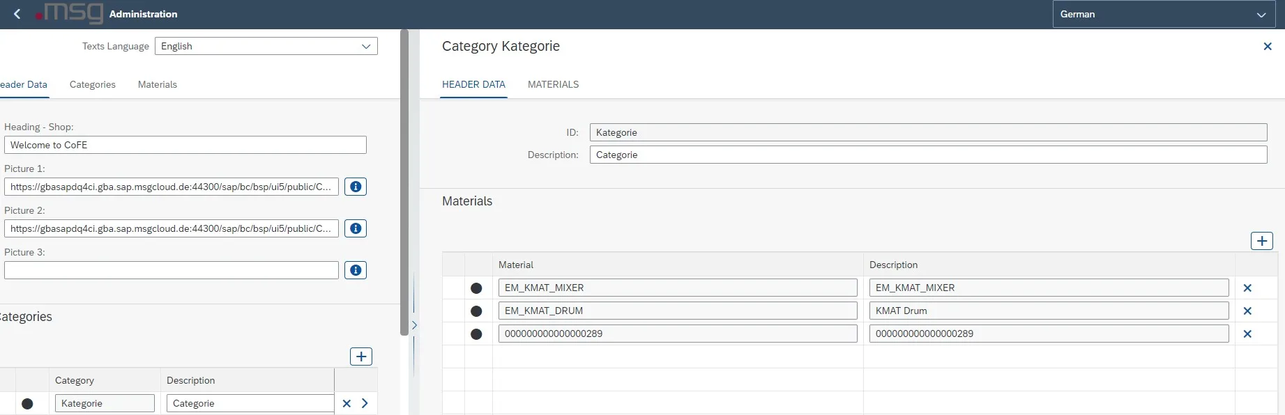 There are two administration interfaces in msg.Variant CoFE. “Global administration” and “Material administration”.