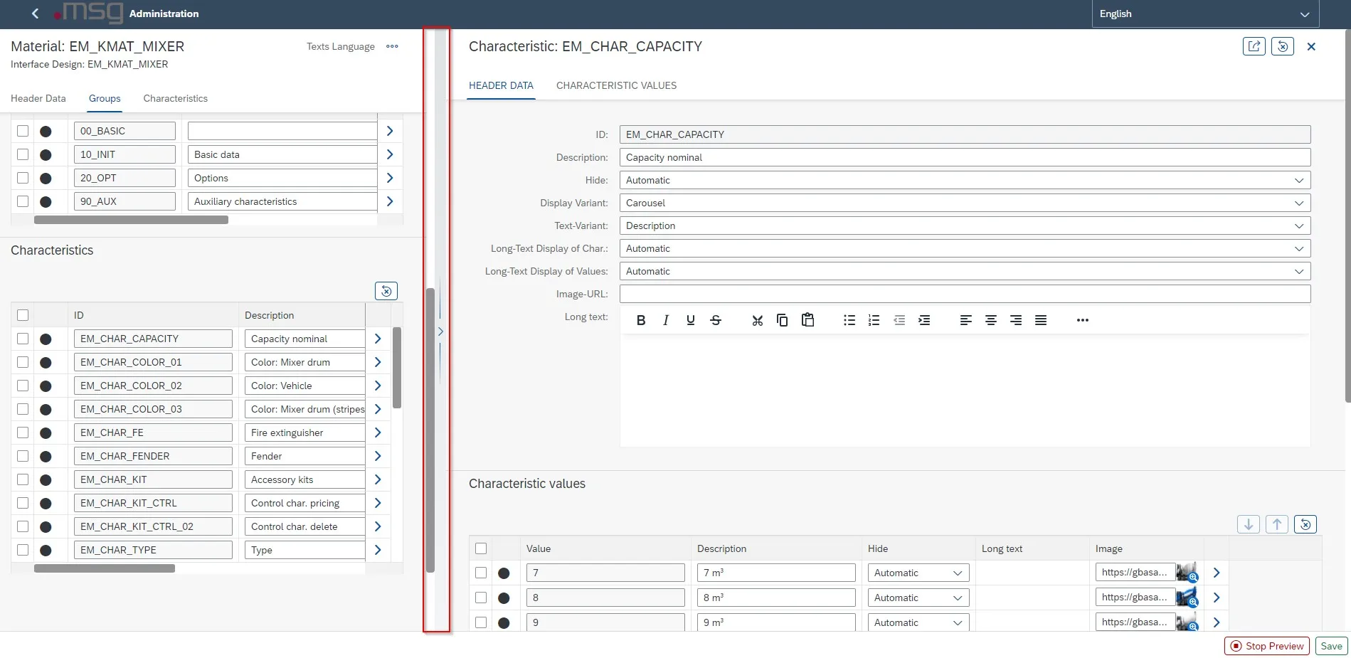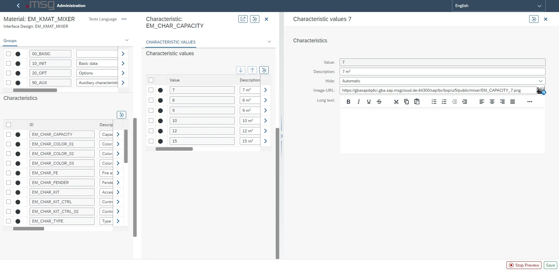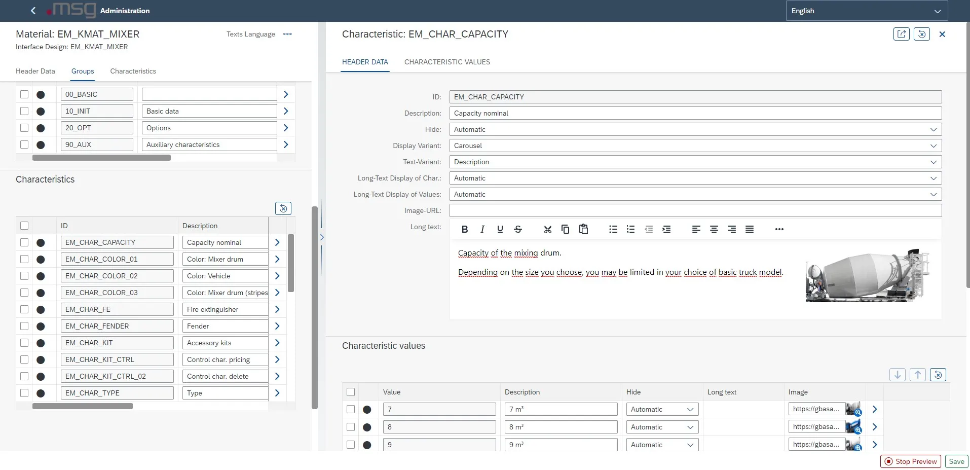 There are two administration interfaces in msg.Variant CoFE. “Global administration” and “Material administration”.