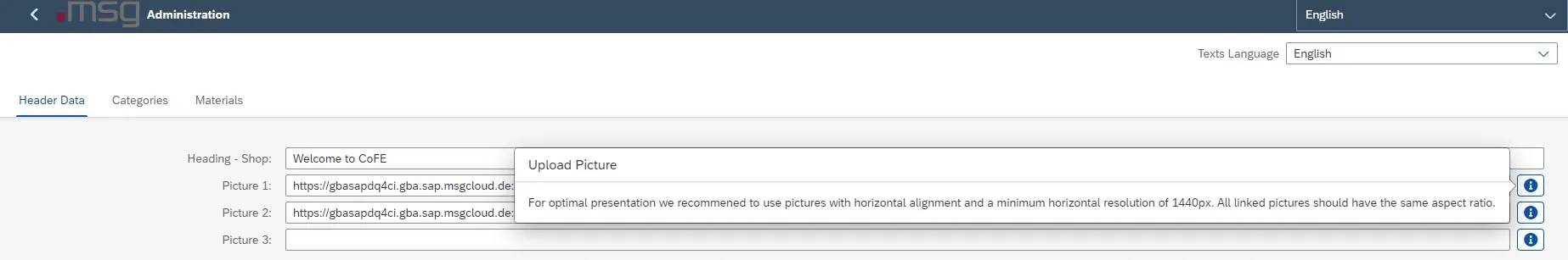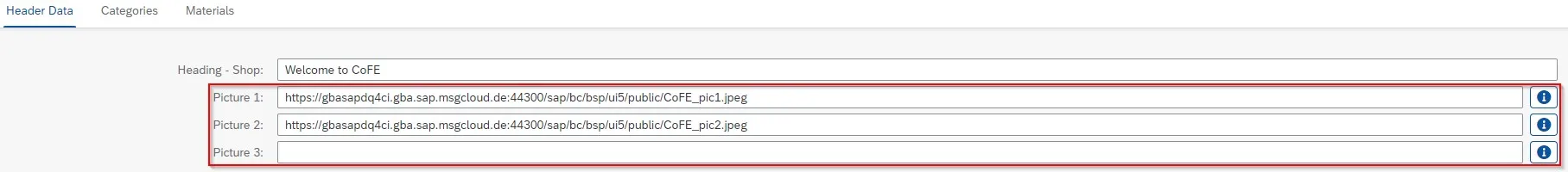 You can also set 3 picture URLs, which are displayed on the initial screen of the shopping cart. Additional information on the size of the pictures, is provided by the information button at the end of the lines.