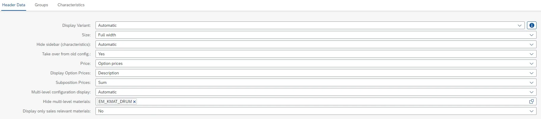 In the header data, the following items are defined: Display variant, size, sidebar to be used, scope and display of the price and settings for multi-level configuration.