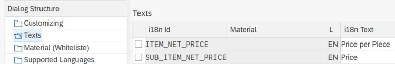 In the “Texts” dialog structure, you can make customer-specific settings such as the definition of prices. These entries are not transported but must be made in each system.
