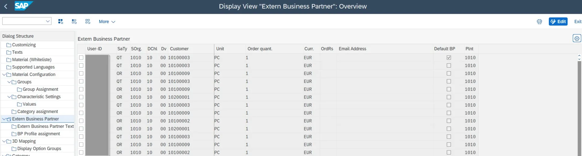 The external business partner table controls the creation of an order using the shopping cart function of an external user.