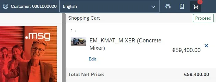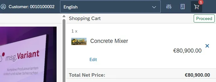 In order to create a customer order or quotation after the configuration, call up the shopping cart and click on the button “Proceed”.