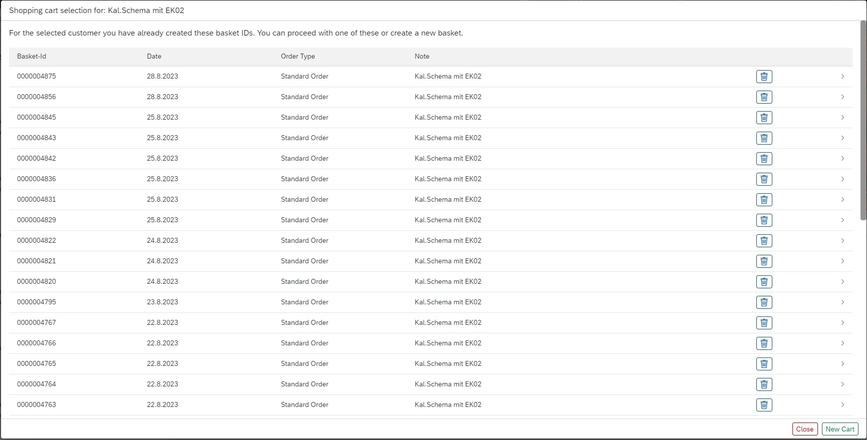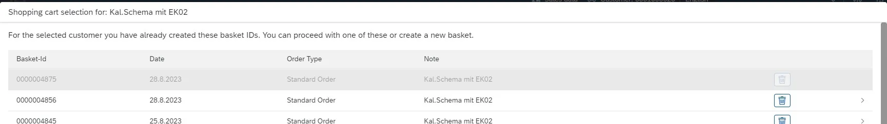 to display a pop-up window in which all saved shopping carts are displayed, which you can call up again with a click. Only shopping carts, which have not yet been ordered, are saved. As soon as they are released for ordering, they are removed from memory.