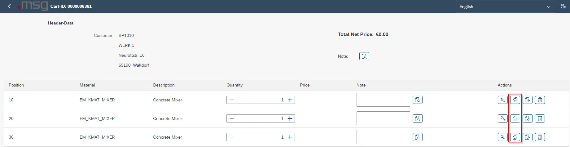 msg.Variant CoFE – Button Overview in the Shopping Cart of an Item