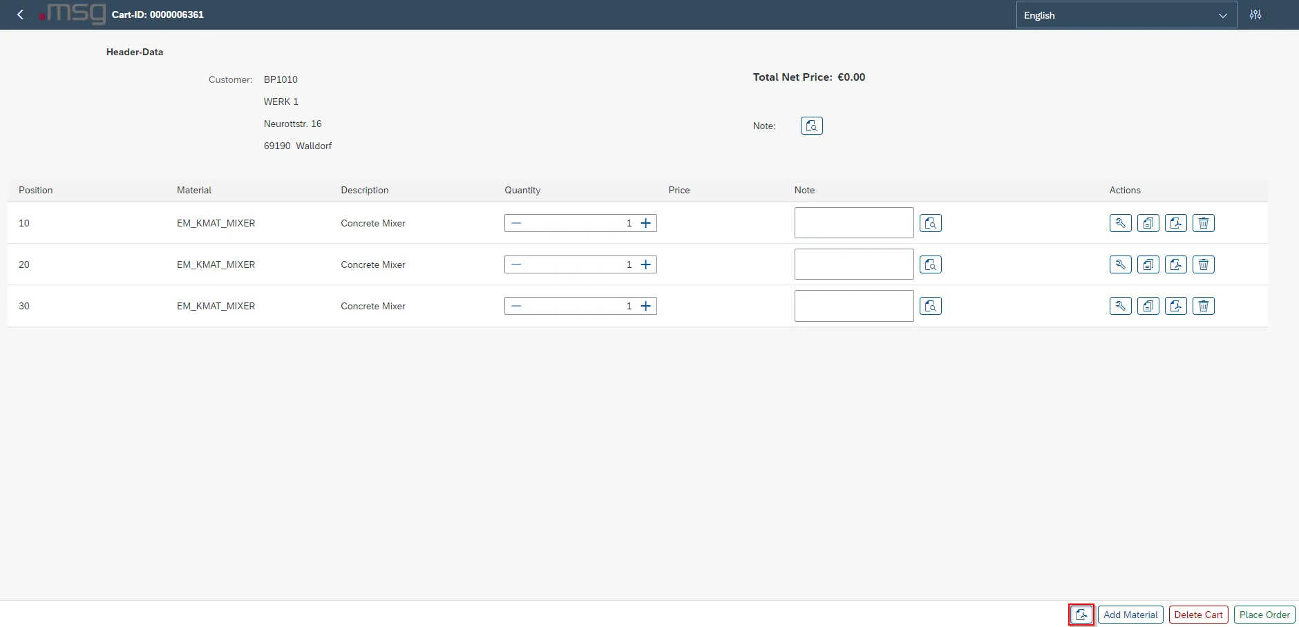 In the item overview, you can find all configured materials to which a note can be added and where you can adjust the quantity.